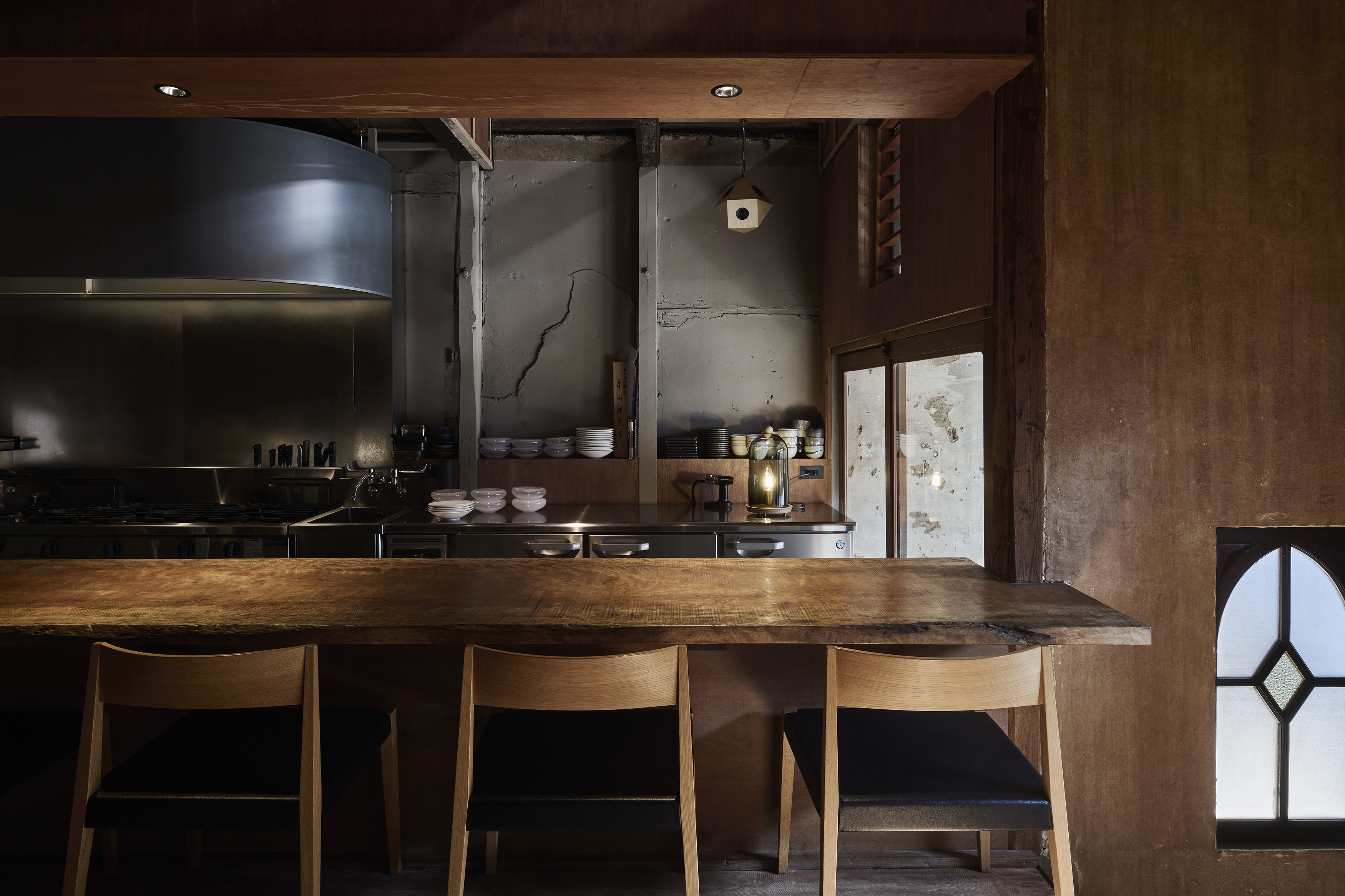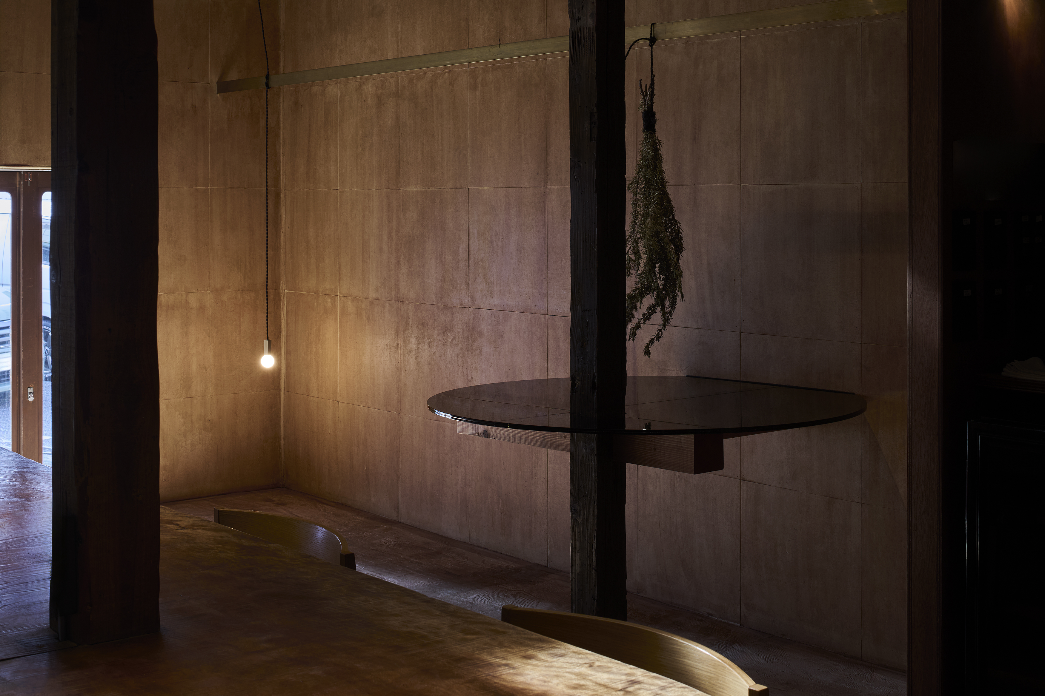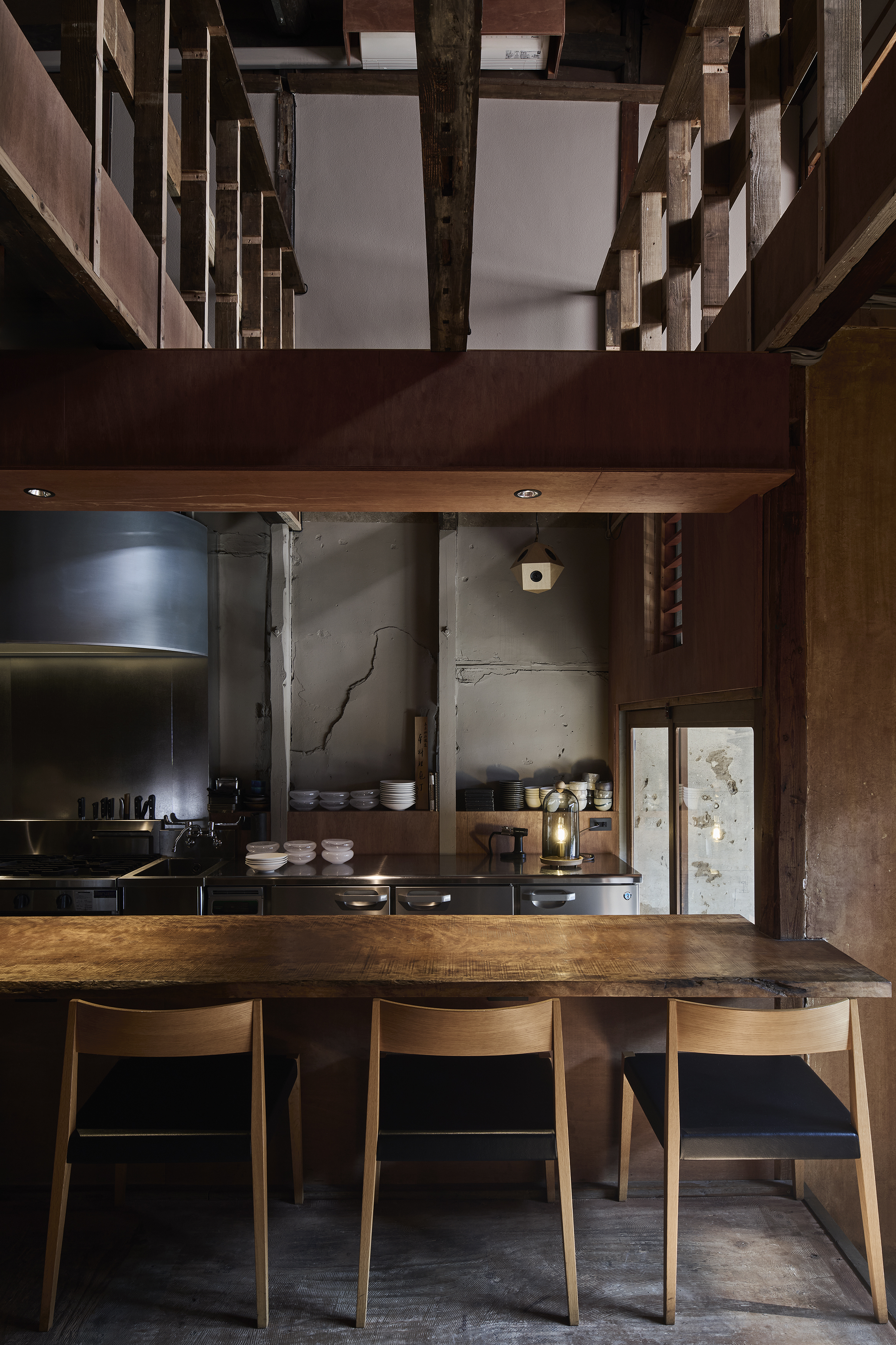 既存店の構成は1階にカウンター席、2階の客席とは吹抜けを介して繋がった空間となっていた。私達はローコストを意識して、既存構成はほとんど変えず、カウンター席を増やす事に集中した。既存カウンターもそのままにカウンターを店の奥に延長した。延長したカウンターは既存カウンターとあえて違う素材にして雰囲気を変えている。新店舗では朝ごはんを提供するとの事から店舗奥の自然光の入らないエリアを何とかして自然光を感じる健全な空間にしたかった。