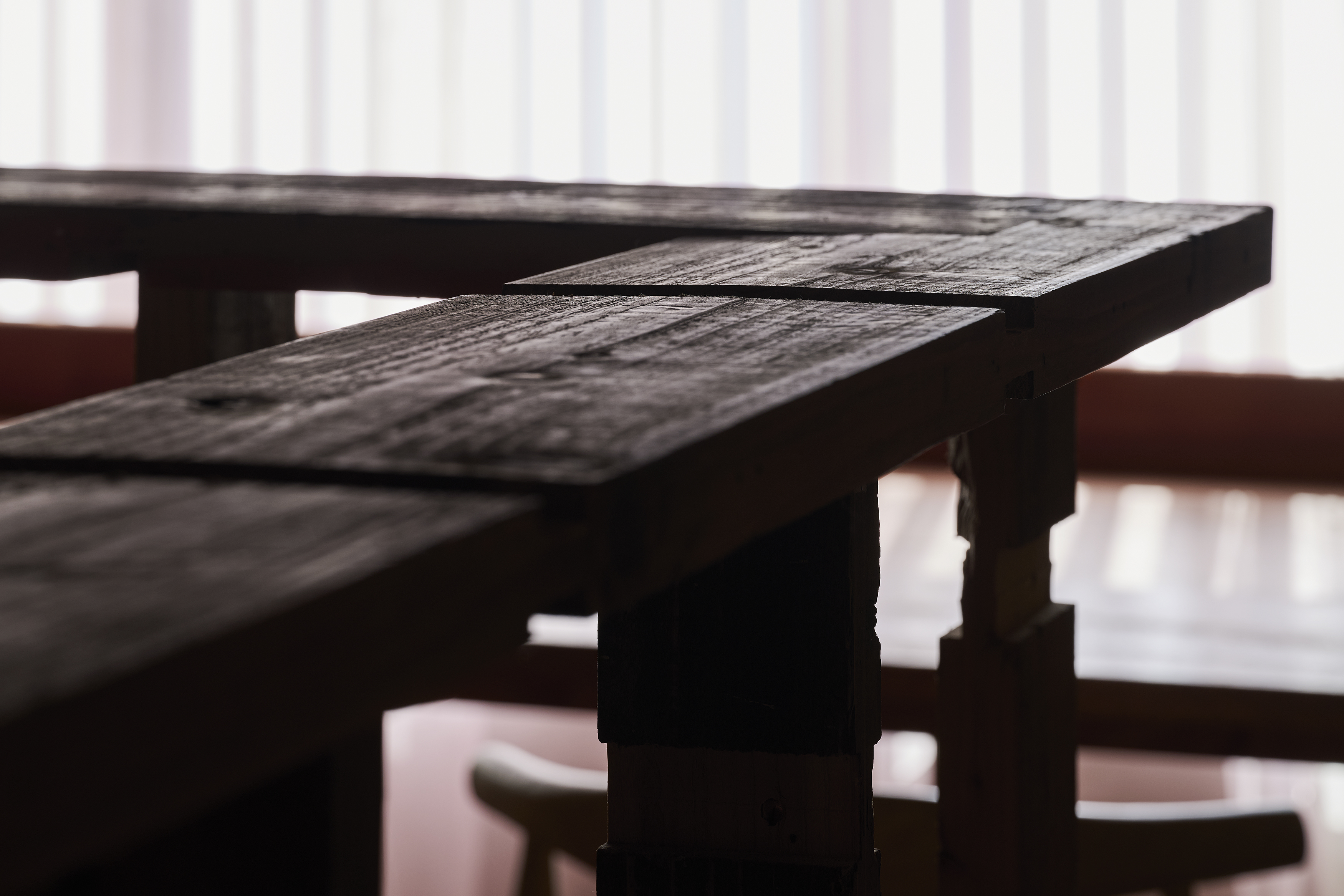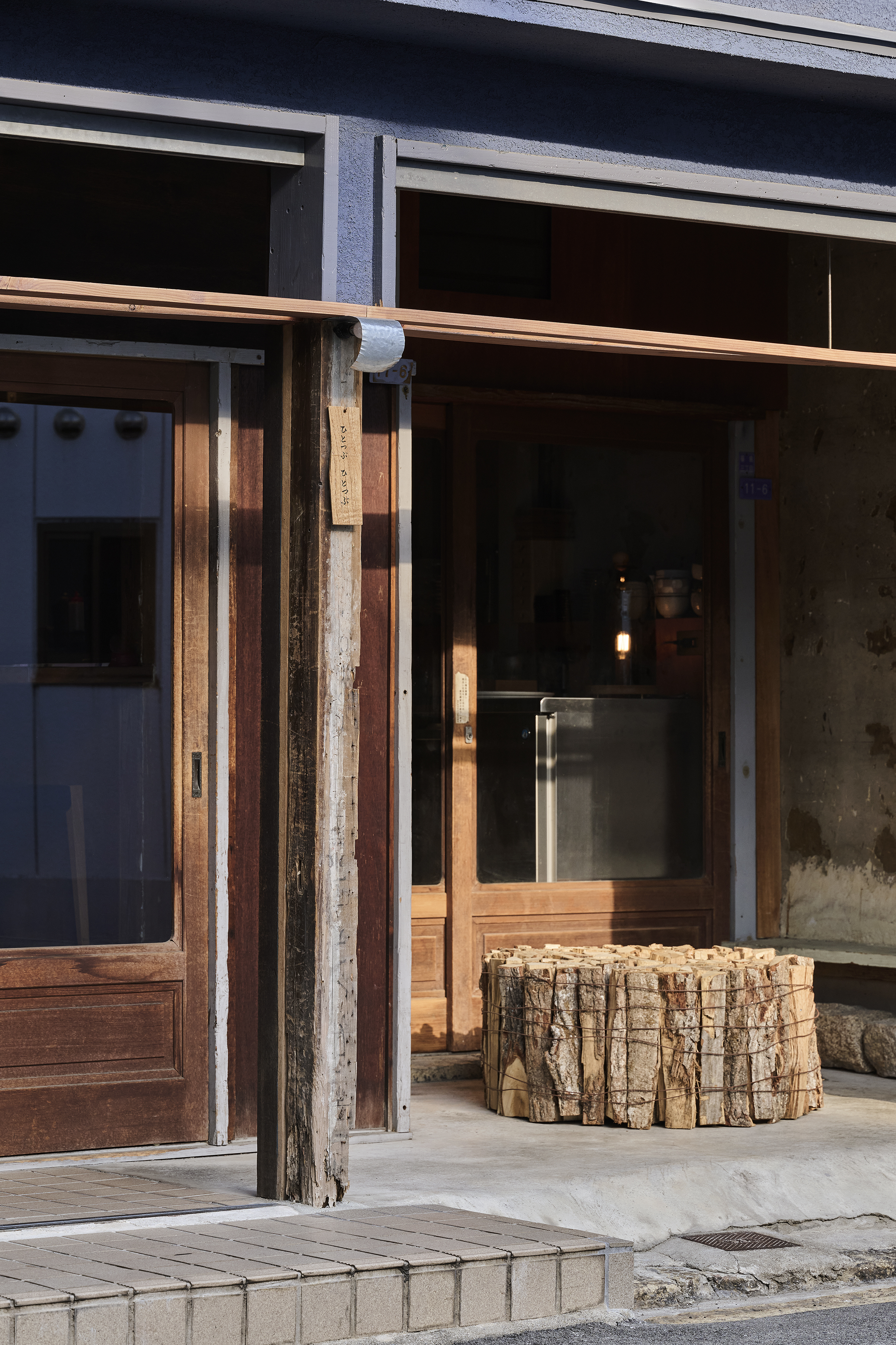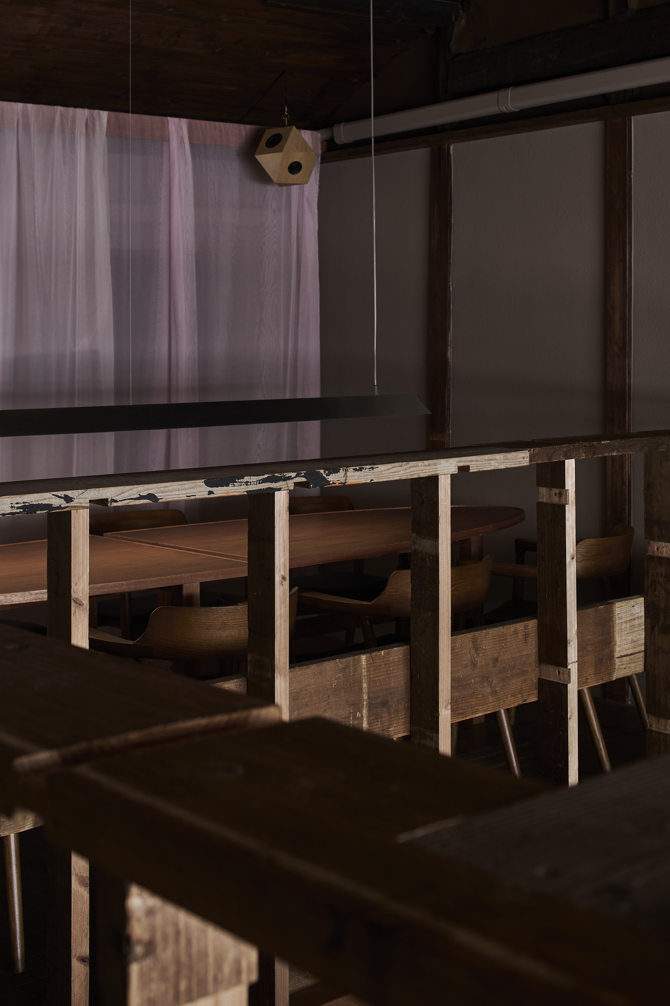 既存店の構成は1階にカウンター席、2階の客席とは吹抜けを介して繋がった空間となっていた。私達はローコストを意識して、既存構成はほとんど変えず、カウンター席を増やす事に集中した。既存カウンターもそのままにカウンターを店の奥に延長した。延長したカウンターは既存カウンターとあえて違う素材にして雰囲気を変えている。新店舗では朝ごはんを提供するとの事から店舗奥の自然光の入らないエリアを何とかして自然光を感じる健全な空間にしたかった。