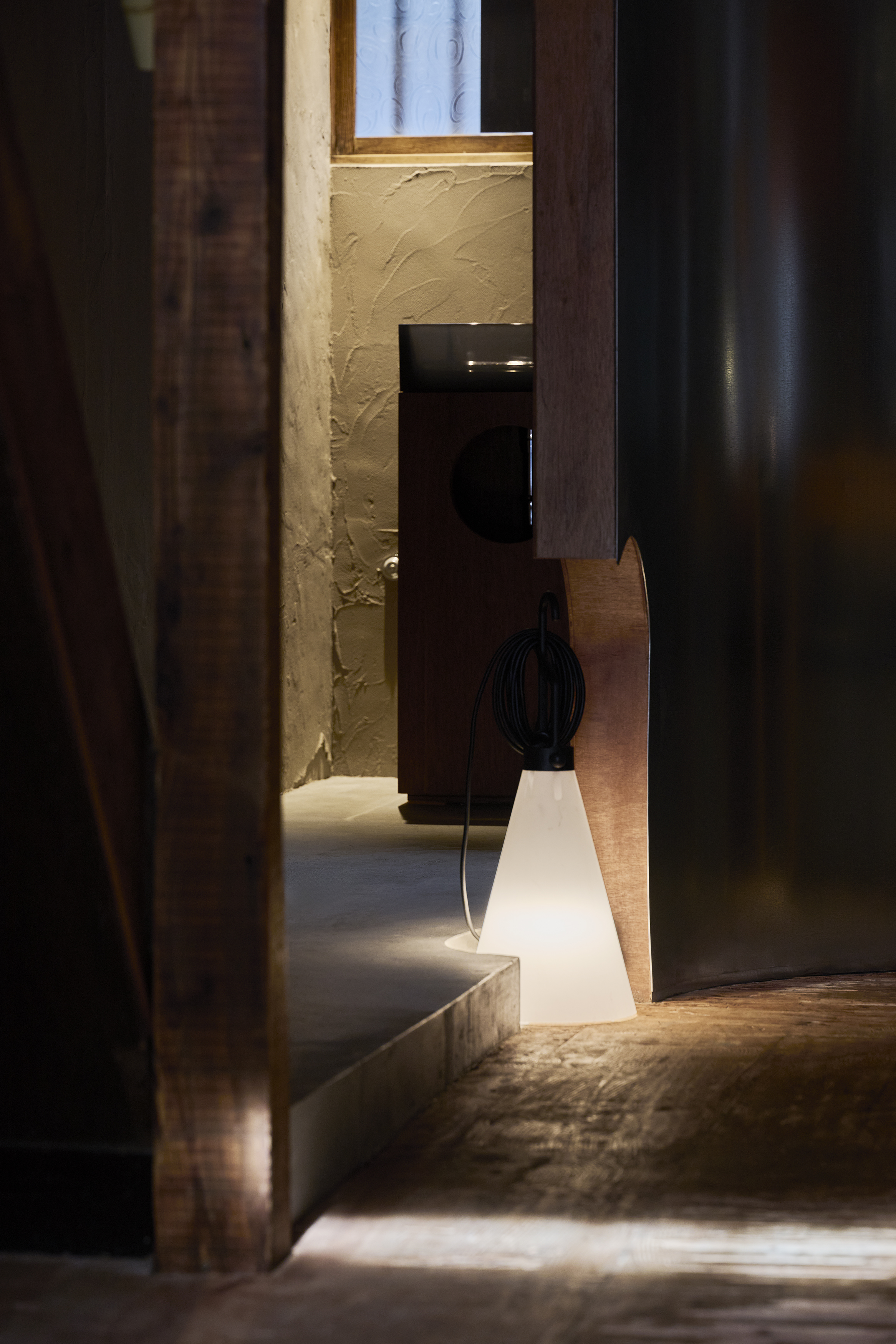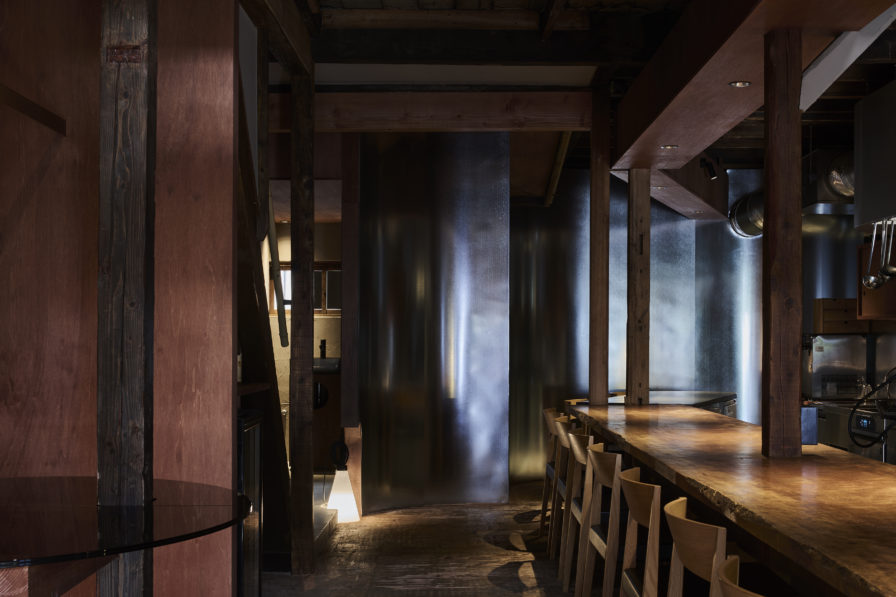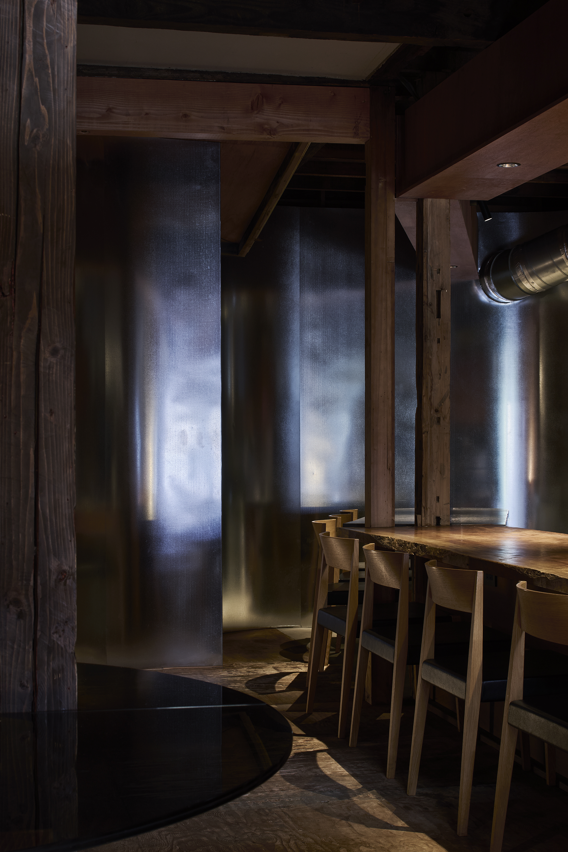 既存店舗の排気フードが溶融亜鉛メッキ鋼板で作られておりR形状をもっていた。現地に訪れた時そのR面に自然光が少し映り込んでいた。私はその現象に着目した。R形状の溶融亜鉛メッキ鋼板の素材がそのまま壁になり店舗の突き当たりの壁と一体化した時、朝の自然光を感じる独自の空間が立ち上がるのではないかと。