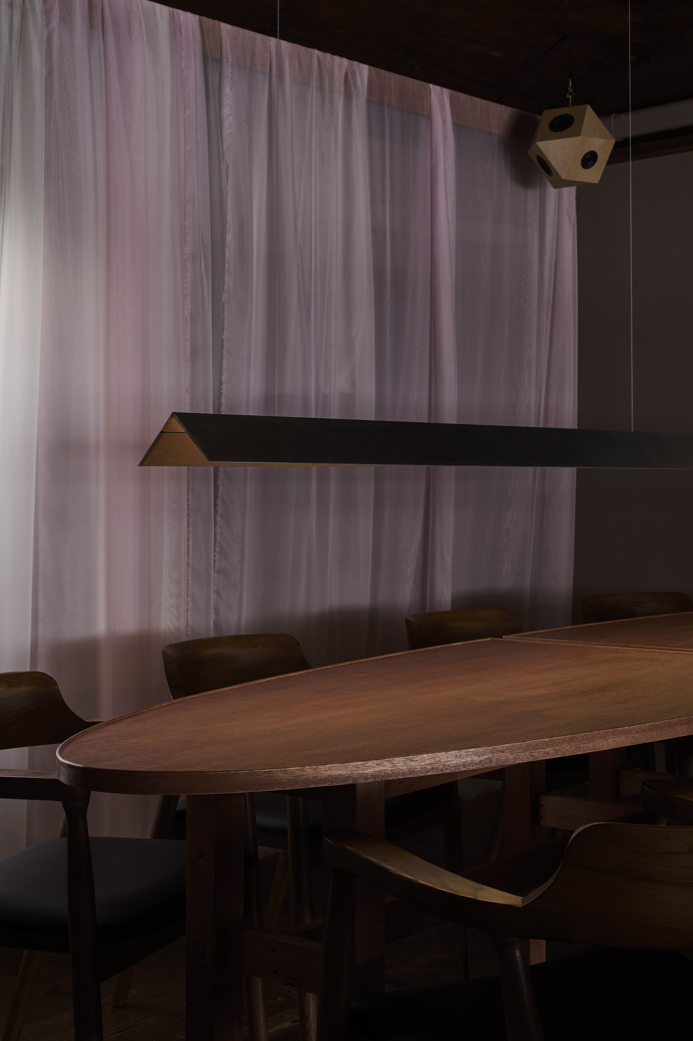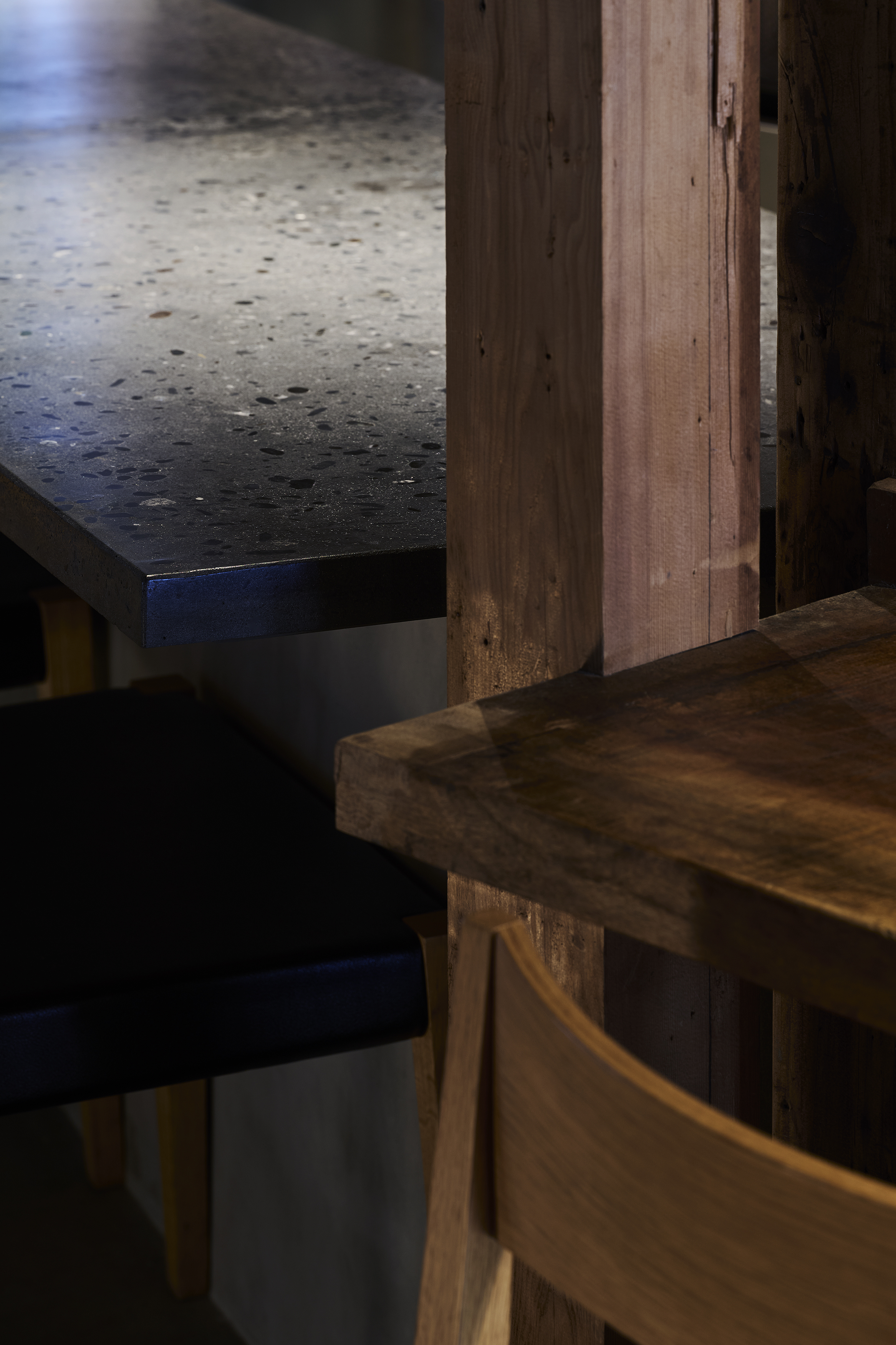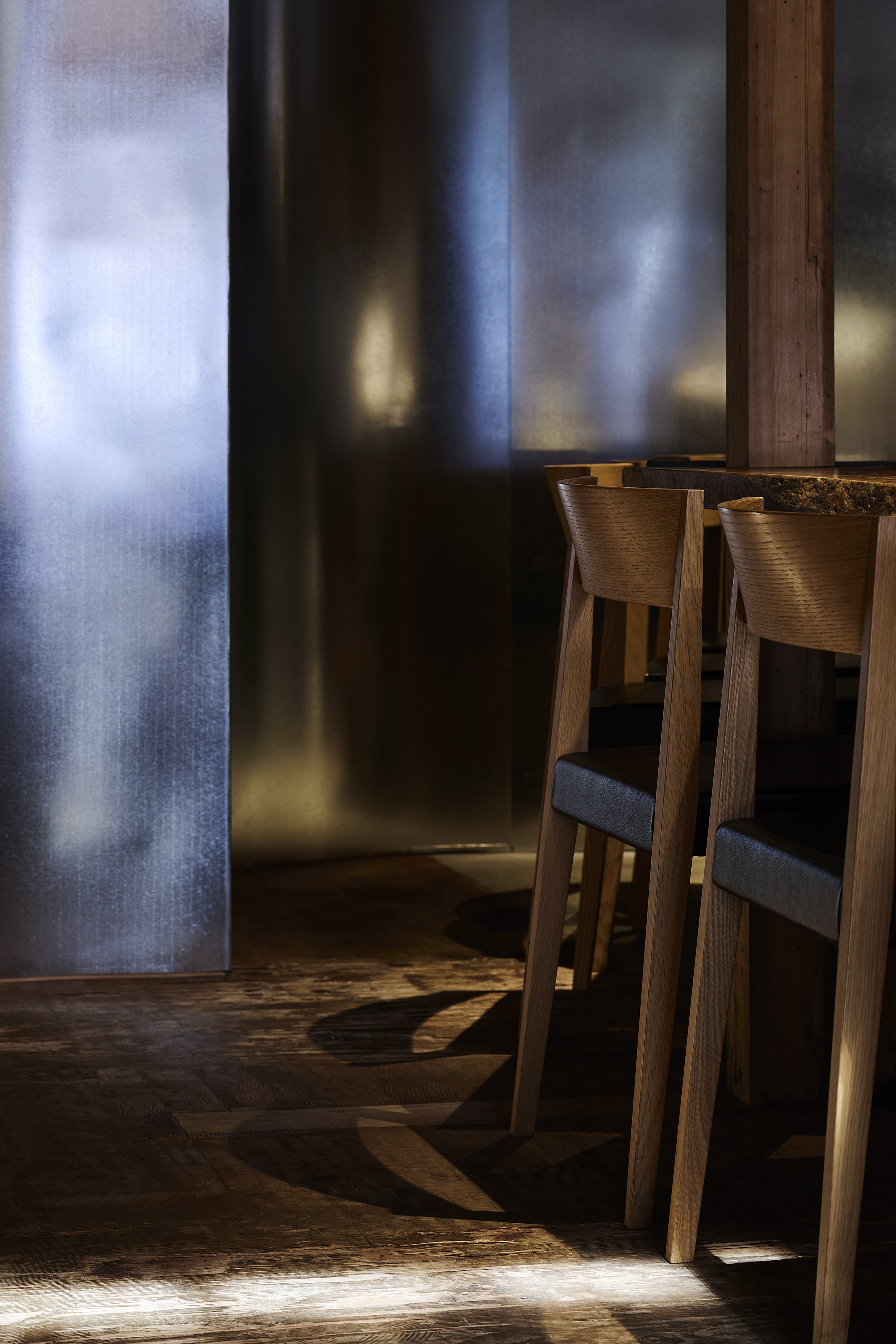 またディナーは2回転を予定しており、デザートを2階で提供する事により、オープン厨房でありながら、片付けと2回転目の仕込み作業が1階でできるメリットをご提案した。2階の空間は1階の個別カウンターとは雰囲気を全く変えてビッグテーブルを囲んだ座席配置とした。お客様同士のファミリアーな雰囲気を作りつつ、ペンダント照明の位置を極端に下げて前に座る人の顔が気にならないようプライバシーを留意したデザインとしている。