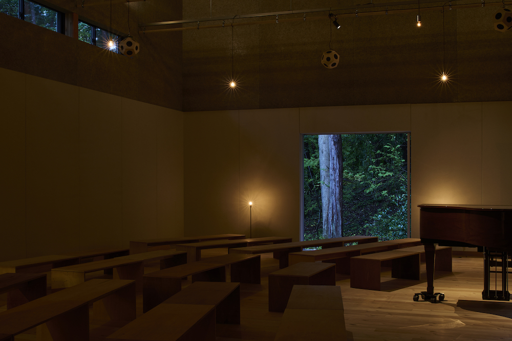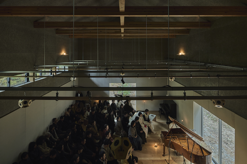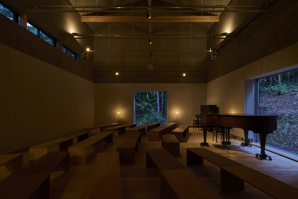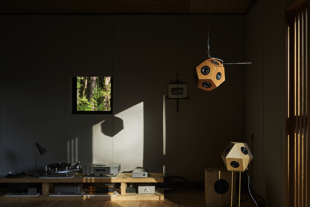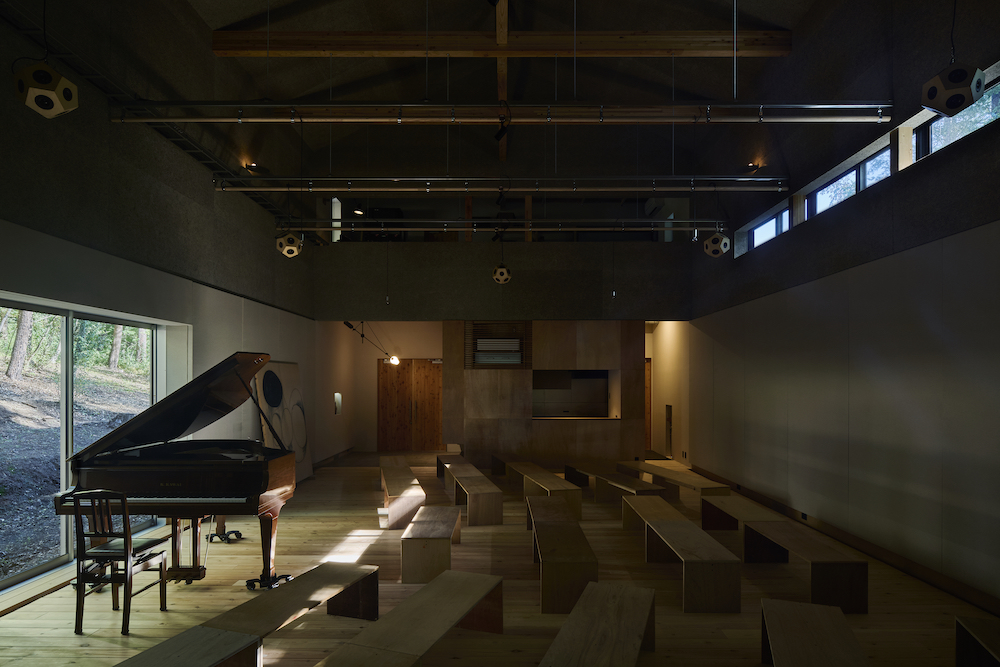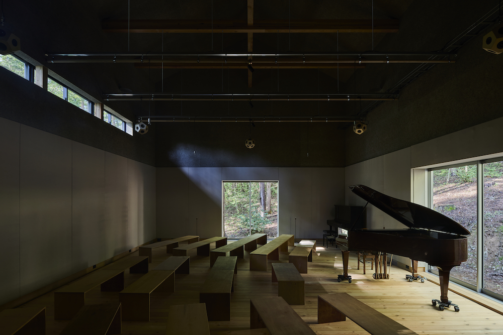 敷地内には東西に約30m伸びる建物があり、その中に試聴室、音楽ホール、工房、事務所が機能的に統合されています。 その建物の側面には、自然の地形と植生をそのまま活かした「森のホール(Forest Hall)」が広がり、人工と自然のあわいに音が息づいています。