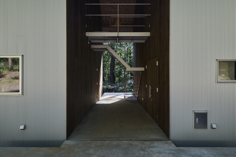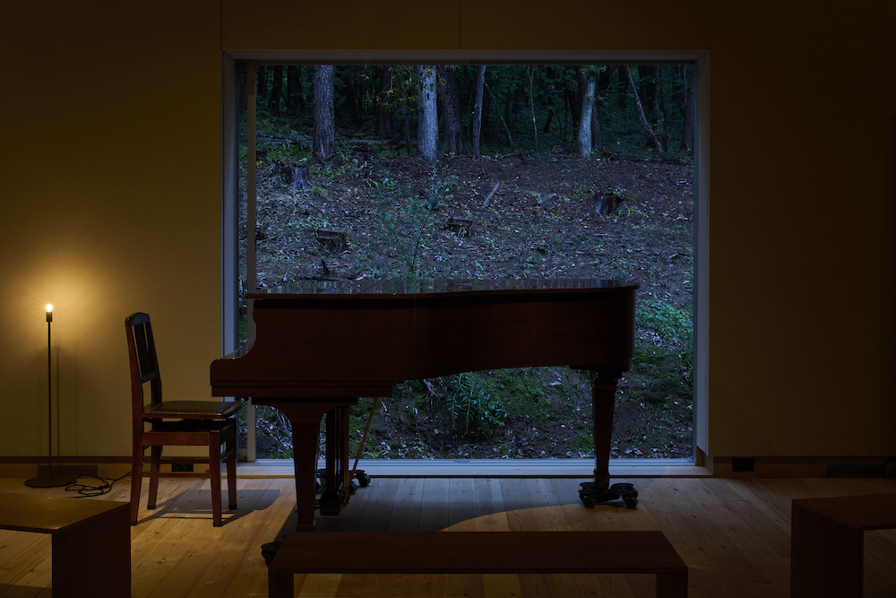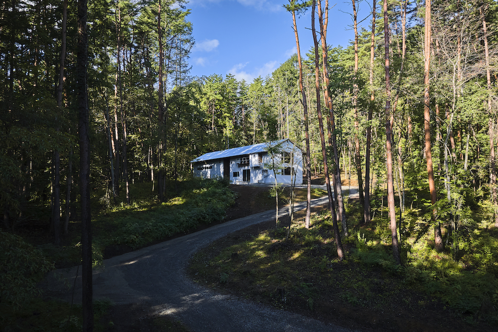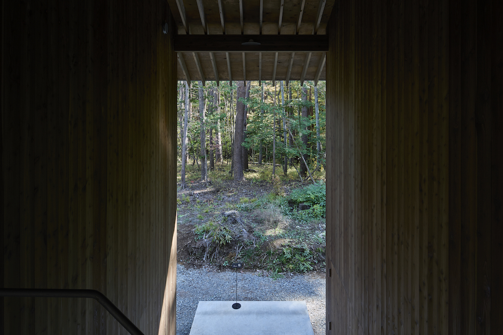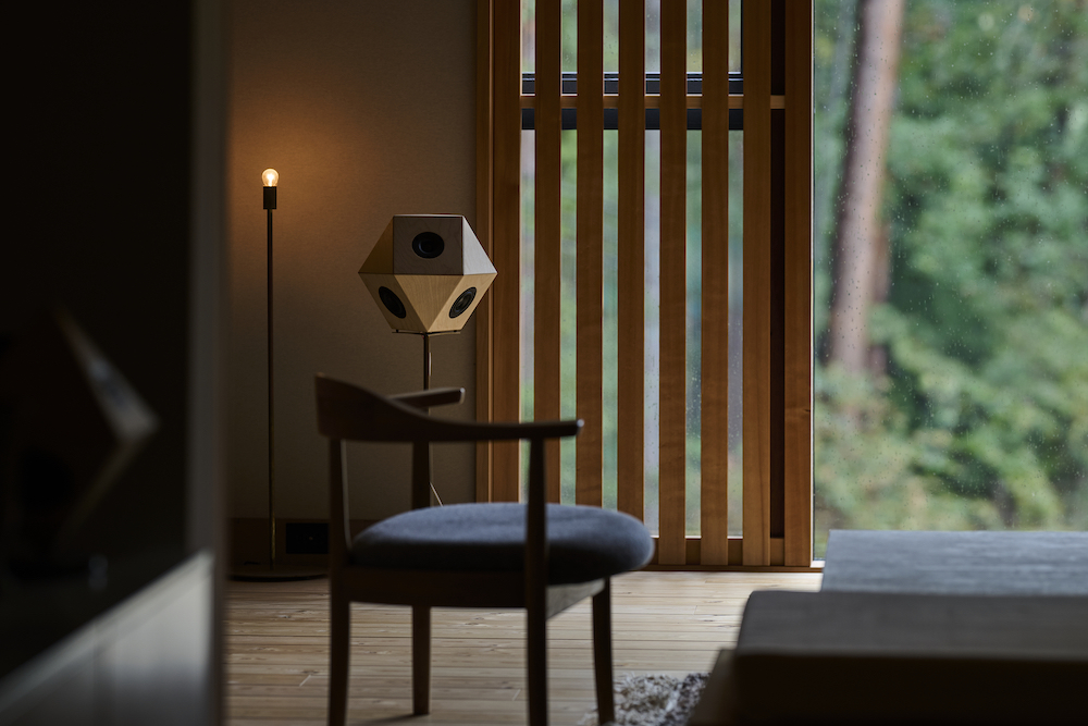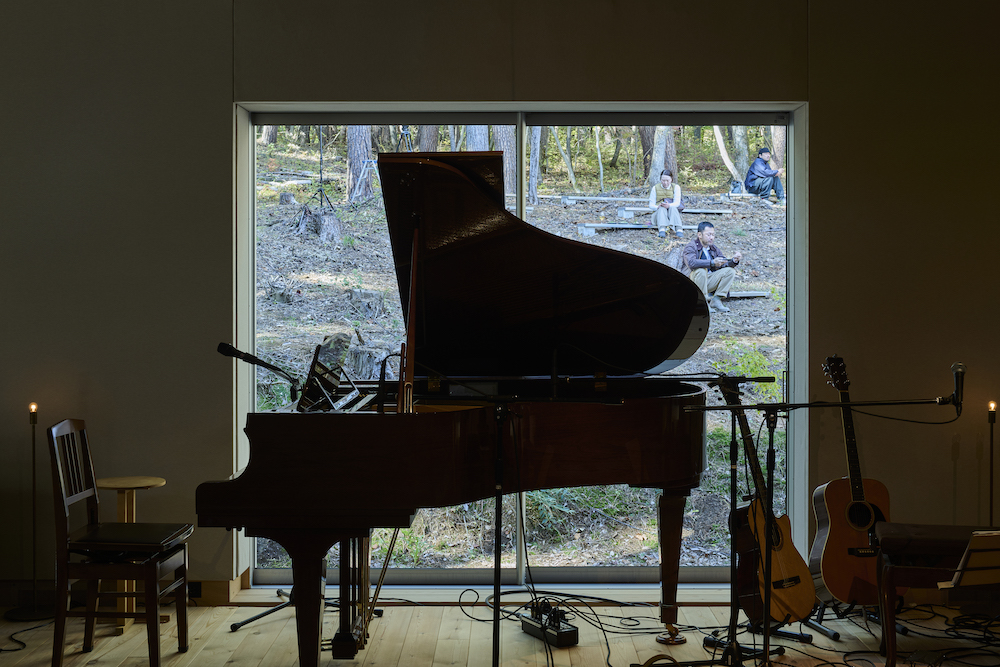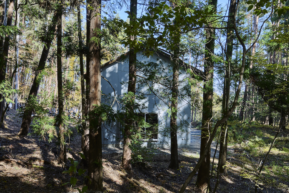 敷地内には東西に約30m伸びる建物があり、その中に試聴室、音楽ホール、工房、事務所が機能的に統合されています。 その建物の側面には、自然の地形と植生をそのまま活かした「森のホール(Forest Hall)」が広がり、人工と自然のあわいに音が息づいています。