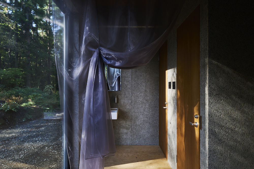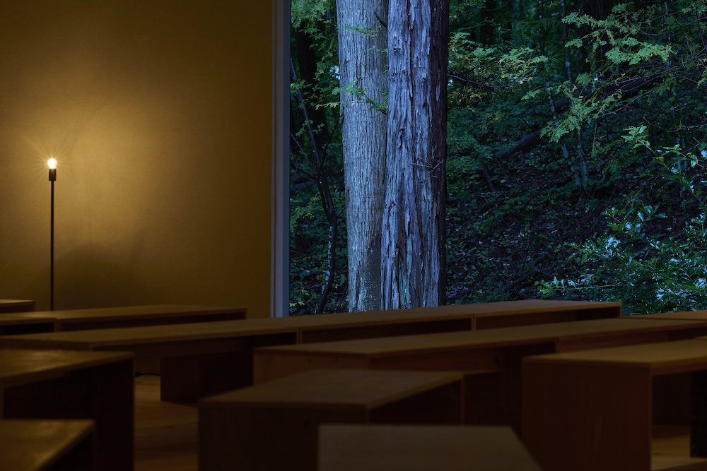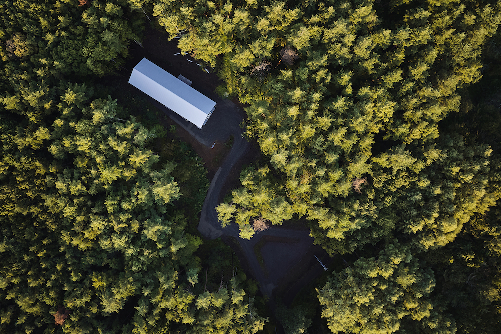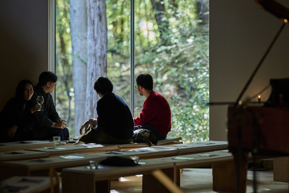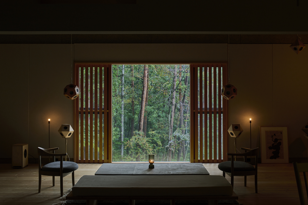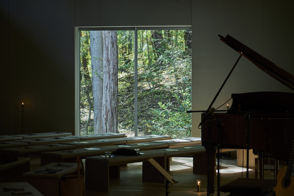 敷地内には東西に約30m伸びる建物があり、その中に試聴室、音楽ホール、工房、事務所が機能的に統合されています。 その建物の側面には、自然の地形と植生をそのまま活かした「森のホール(Forest Hall)」が広がり、人工と自然のあわいに音が息づいています。